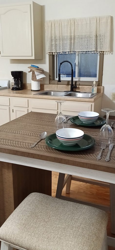 The fully equipped kitchen includes all dishware and essentials needed for simple meal preparation, whether you’re enjoying a quiet breakfast or a romantic dinner in.